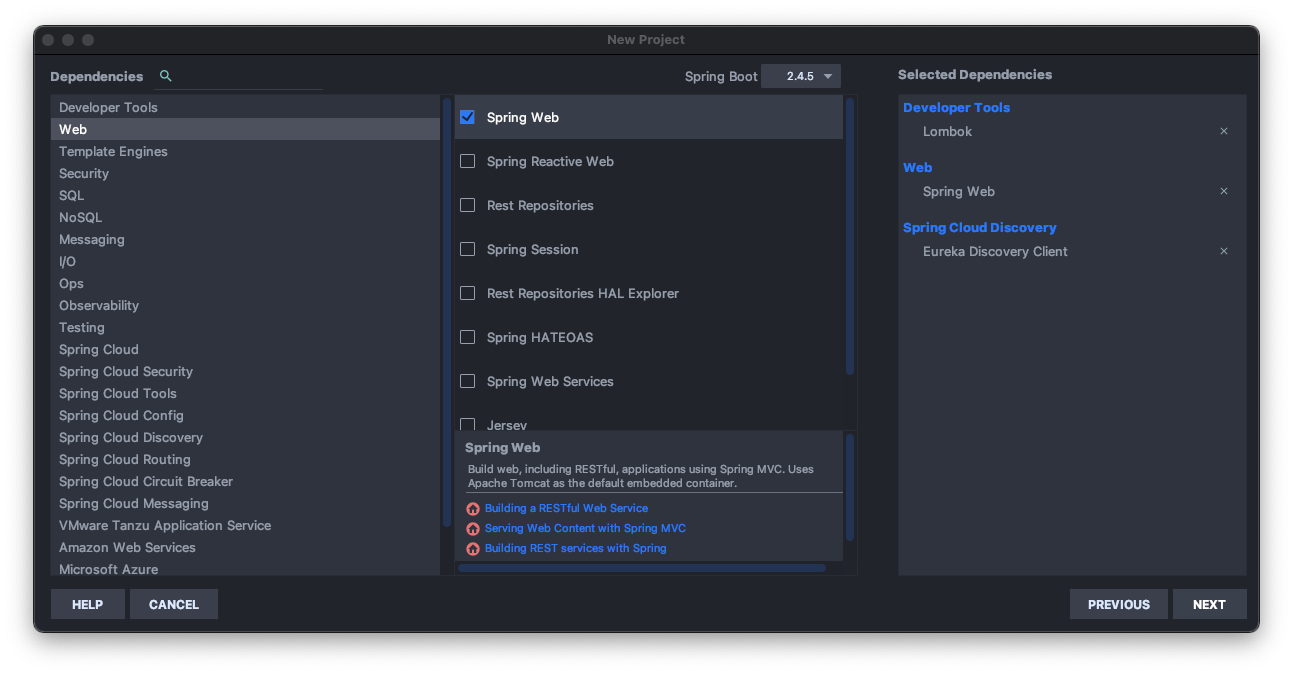 여기서 Spring Boot의 버전과 Spring Cloud 의 버전은 매우 중요하다. 각각 호환이 되는 버전이 따로 있으니 충분히 조사해보도록 하자. 일단 현재 2021년 4월 기준으로는 Spring Boot 2.4 대 버전과 Spring Cloud 2020 버전이 권장되고 있다.