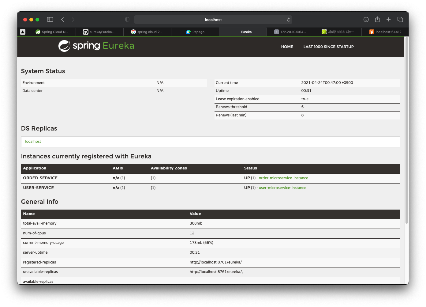 그리고 localhost:8761 로 접속하면 Eureka Dashboard를 확인할 수 있는데 앞으로 자주 보게될 대쉬보드이다.