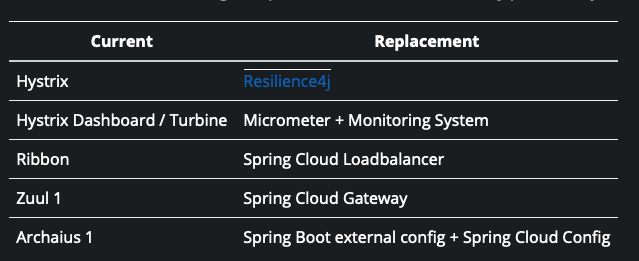 최초에는 모든 서비스가 Spring Cloud 에 의해서 관리되었지면 현재는 몇몇 기술들을 재구성 혹은 발전시키거나 독립적인 서비스로 진화시켜 기존의 서비스들은 Maintenance 모드로 들어간 것들이 존재한다.
