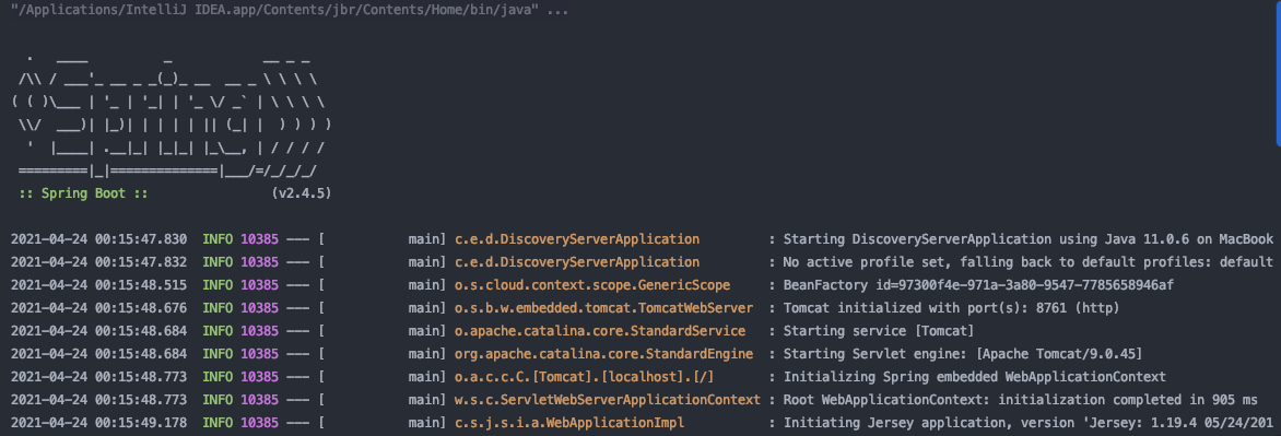 프로젝트의 Application이 돌아가는 루트 디렉토리로 가서 DiscoveryApplication.java를 클릭한다.