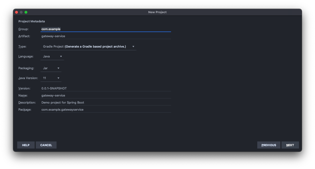 지난 시간에 만들었던 폴더 아래에 gateway-service 라는 Spring 프로젝트를 만들어주자.