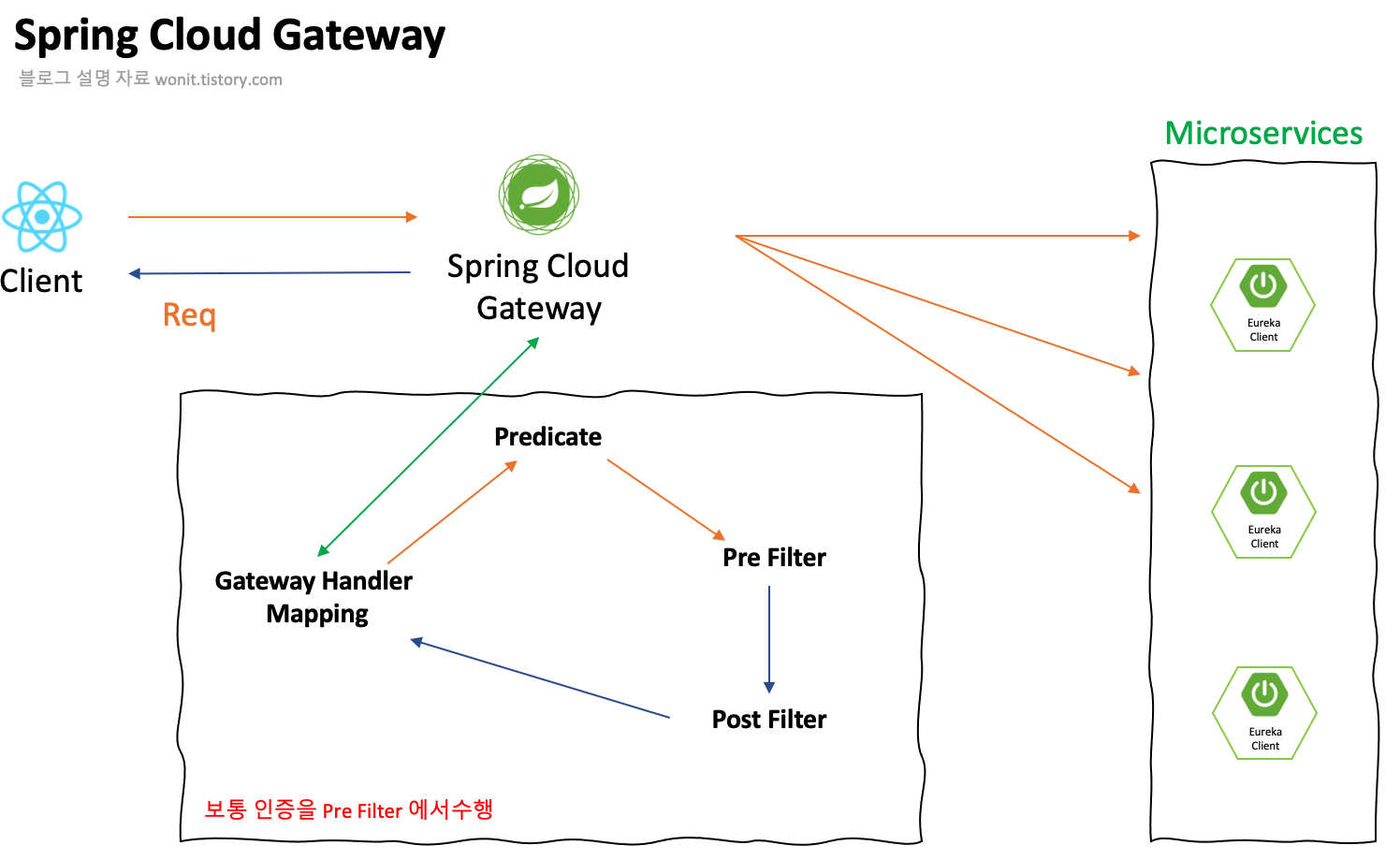 - Client 는 Spring Cloud Gateway 에 요청을 보낸다.