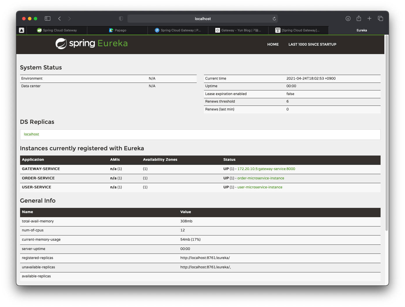 그리고 Eureka와 다른 Microservice 들을 실행시켜서 Eureka Dashboard에 잘 나오는지 먼저 확인해보자.