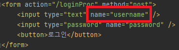 loadUserByUsername의 매개변수 username은 화면에서 넘어온 input의 name 속성에 설정한 이름과 동일해야 합니다.
