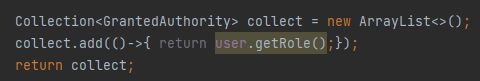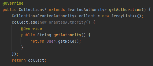new GrantedAuthority()의 익명 클래스를 이용하여 내부에 메소드를 Override 해서 Collect에 넣어주는 방법입니다.