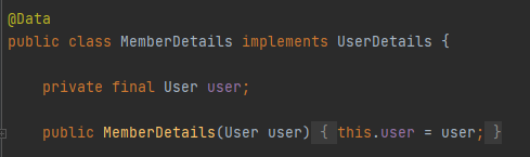 그리고 해당 객체는 받아온 user의 정보까지 넣어줘야 하기에 UserDetails를 상속받은 MemberDetails를 하나 만들고 아래와 같이 설정해줍니다.