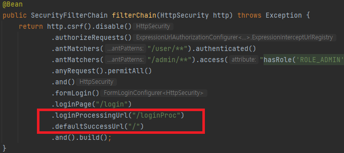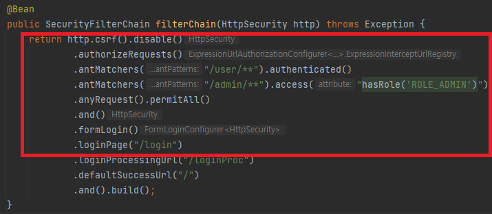 하지만 WebSecurityConfigurerAdapter는 Deprecated 되었으므로 사용하지 않고 아래와 같이 SecurityFilterChain을 Bean으로 등록하여 사용합니다.