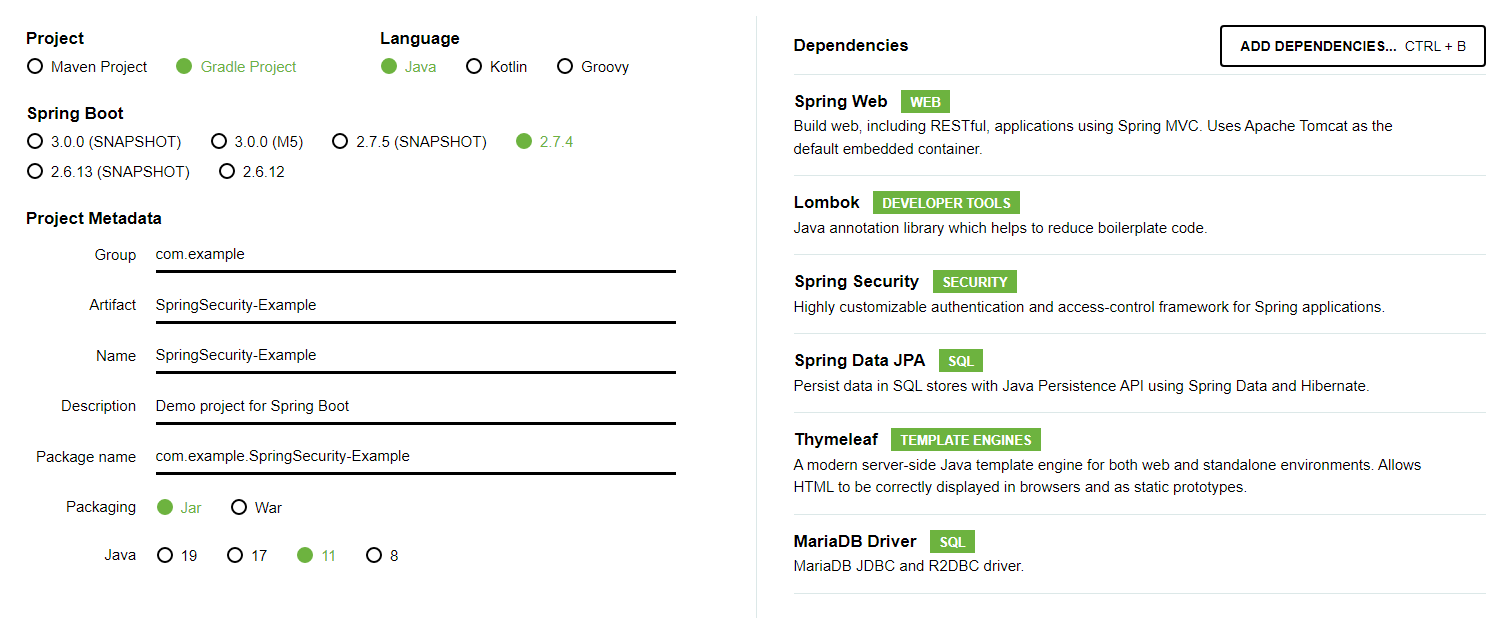 start.spring.io를 통해 위와 같이 설정하고 진행했습니다.