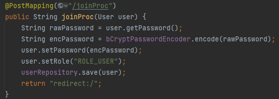 해당 암호화 기능을 이용하지 않는다면 아래 설명할 Spring Security의 로그인 기능을 이용할 수 없습니다.