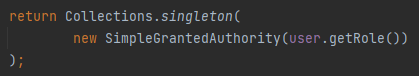 로그인 시 각각의 사용자마다 권한을 부여해줘야 합니다. 권한에 따라 특정 API에 대한 인증이 승인 될 수도 있고 거절될 수도 있기 때문에 Security를 이용해 권한을 부여해줘야 합니다. 권한은 여러개가 될 수 있으므로 Collection 형태의 값으로 반환해줍니다.