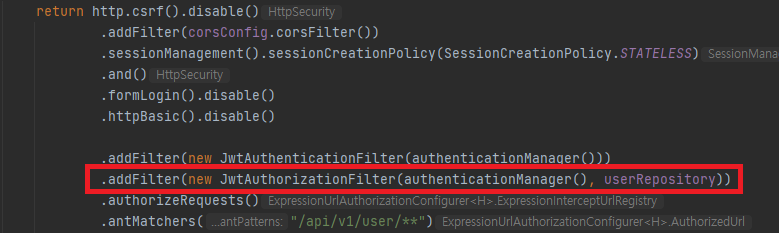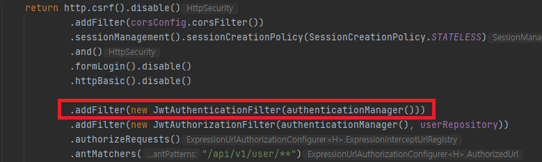 그리고 해당 요청이 들어오면 UsernamePasswordAuthenticationFilter를 상속한 JwtAuthenticationFilter 클래스가 실행됩니다. JwtAuthenticationFilter 는 아래에 설정에 addFilter를 통해 넣어줬습니다.