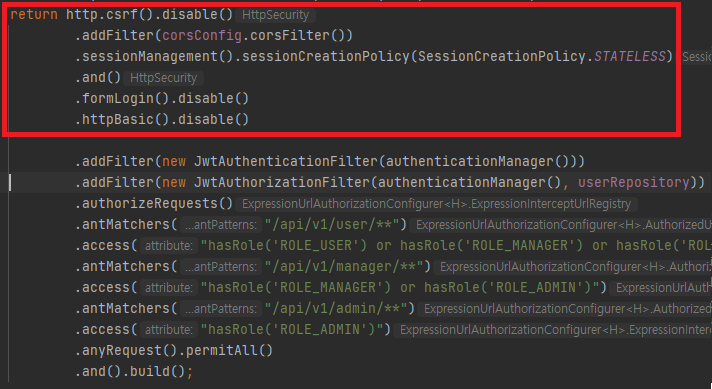 JWT 설정을 위해서는 formLogin 기능을 빼고 위와 같이 사용자가 직접 필터 클래스를 만들어줘야 합니다.