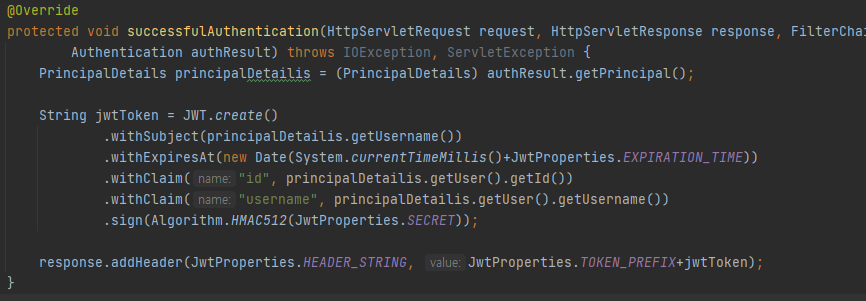 Authentication 객체가 성공적으로 만들어 졌다면 아래의 Success 메소드가 수행되고 응답 값에 JWT 토큰을 만들어주고 사용자에게 전달해줍니다.