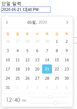 색상도 많이 들어가지 않아 깔끔하고 어지간한 페이지에 조화로운 느낌이며 옵션 또한 많은 기능을 제공하고 있어서 큰 문제없이 기능을 제어하고 동작시킬 수 있고, 달력 + 시간조합도 가능하기 때문에 일자와 시분초까지 표현해야 하는 경우에도 유용하게 사용할 수 있습니다.