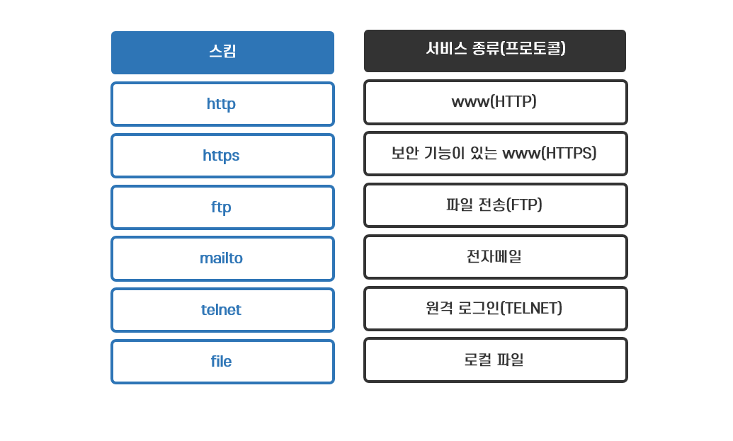 인터넷에서 가장 많이 사용하는 웹서비스는 HTTP 프로토콜을 따르기 때문에 http를 스킴으로 사용합니다. 웹 브라우저 주소 창에 http://로 시작하는 URL을 입력하기 때문에 URL이 웹 서비스에서만 사용된다고 생각하기 쉬운데 웹 서비스뿐만 다른 서비스에서도 ftp, file, mailto 등의 스킴을 가진 URL을 사용합니다.