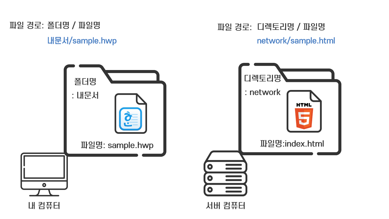 내 컴퓨터에서는 파일 경로만 알면 파일에 접근할 수 있지만 클라이언트가 서버 컴퓨터에 저장된 파일에 접근하기 위해서는 파일 경로 뿐만 아니라 서버 컴퓨터의 위치도 알아야 합니다. 그래서 서버 컴퓨터에 저장된 파일의 위치를 표시하는 URL은 파일의 경로 외에 서버 컴퓨터의 위치를 알려주는 정보가 추가로 필요합니다.