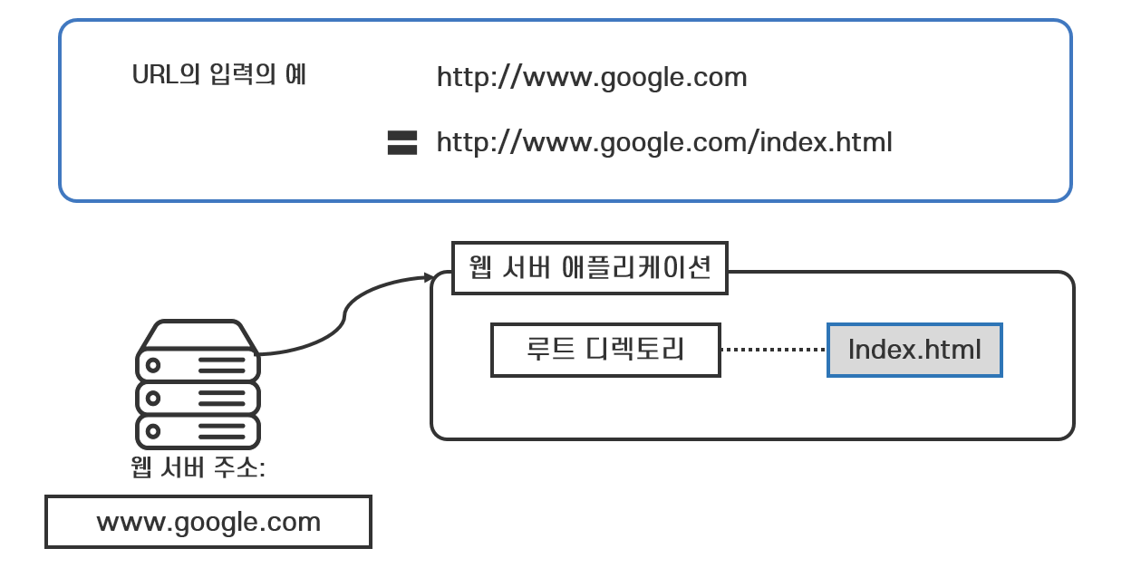 이렇게 파일 경로명이 아무 것도 없는 경우에는 서버 애플리케이션의 최상위 디렉토리인 루트 디렉토리 아래에 저장되어 있는 파일에 접근하게 됩니다. 서버 측에서 파일경로가 지정되지 않았을 때 클라이언트에게 보여줄 웹 페이지를 미리 설정된 파일명, 주로 index.html이라는 파일명으로 루트 디렉토리에 저장해 놓기 때문입니다. 따라서 사용자가 www.google.com라고 입력한 URL은 www.google.com/index.html와 동일한 의미를 갖습니다.