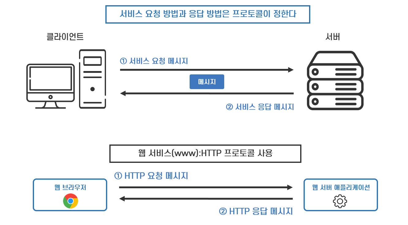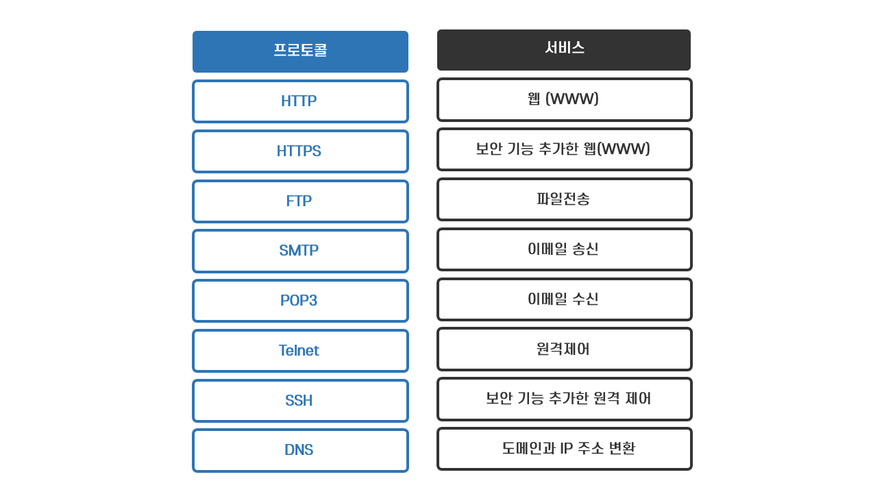 클라이언트와 서버가 어떤 방식으로 요청과 응답을 할 것인지는 응용 계층의 프로토콜이 정합니다. 서비스마다 필요한 기능이 다르기 때문에 고유한 프로토콜이 존재합니다. 따라서 응용 계층에는 다른 계층과 달리 서비스 종류만큼 다양한 프로토콜이 있습니다. 인터넷에서 사용되는 서비스 중 가장 대표적인 웹 서비스(WWW)는 HTTP라는 프로토콜을 사용합니다.