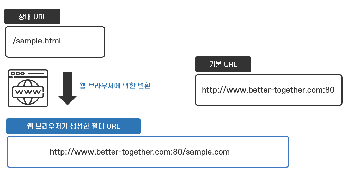 웹 브라우저 사용자가 상대 URL로 웹 서버의 리소스에 접근할 수 있는 것은 웹 브라우저가 기본 URL을 사용해 상대 URL을 절대 URL로 변환하는 기능을 갖고 있기 때문입니다. 웹 브라우저는 리소스에서 명시적으로 제공*하는 기본 URL을 사용하거나, 기본 URL이 명시되어 있지 않은 경우 절대 URL을 가진 다른 리소스에서 기본 URL을 추출하여, 상대 URL을 절대 URL로 변환한 후 리소스에 접근하는 역할을 합니다.