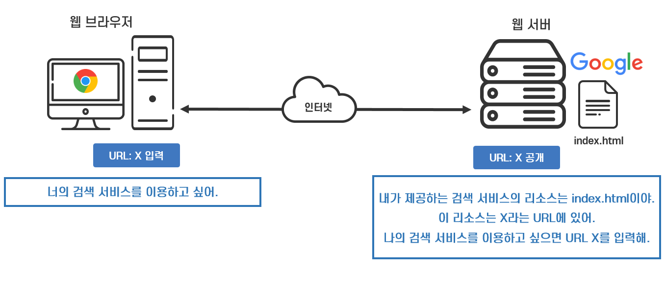 예를 들어, 웹 서비스를 제공하는 웹 서버는 자신만의 특징이 담긴 서비스를 제공하는 리소스(index.html과 같이 파일 확장자가 html 파일 등)가 저장된 위치인 URL을 공개하고, 웹 서비스를 요청하는 클라이언트, 즉 웹 브라우저는 원하는 서비스의 리소스가 저장된 URL을 입력함으로써 그 서비스를 이용하겠다는 의사를 전달하는 것입니다.