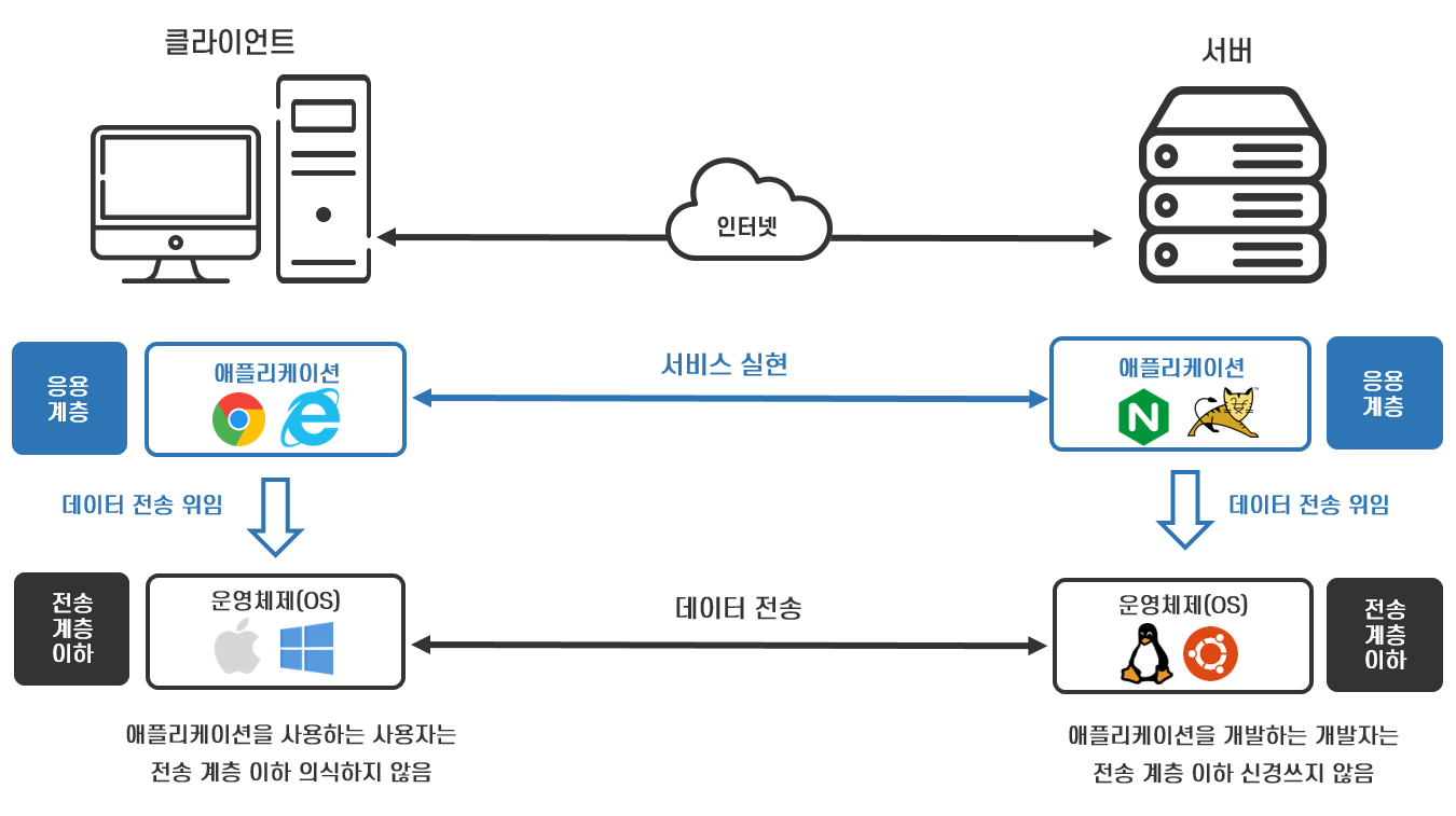 사용자뿐만 아니라 애플리케이션을 개발하는 개발자도 응용 계층을 제외한 나머지 계층은 크게 신경 쓰지 않습니다.