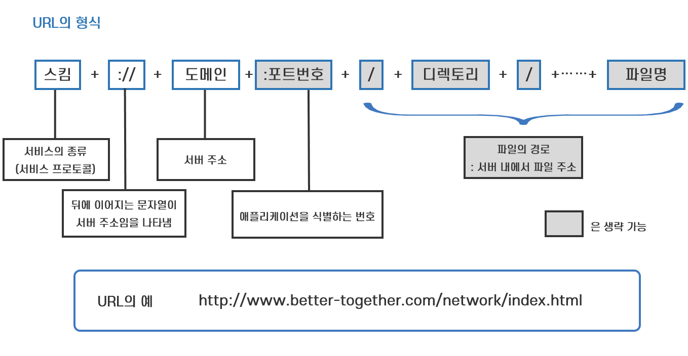 클라이언트가 'http://www.better-together.com/network/index.html'이라는 URL을 사용하여 서비스를 요청한 경우 이를 해석하면,인터넷에서 www.better-together.com이라는 주소를 가진 웹(http) 서버에 설치된 포트 번호 80번(http로 식별한 웹 서버의 웰 노운 포트)을 가진 애플리케이션이 만든 network라는 디렉토리안에 있는 index.html이라는 파일을 전송해 달라는 요청입니다.