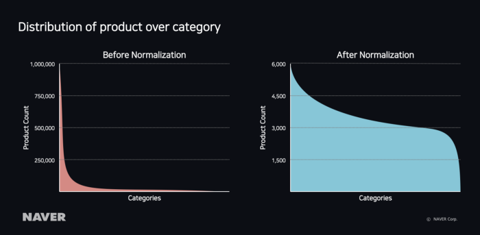 data normalization을 적용하면 오른쪽 그래프와 같이 카테고리별 상품 수가 고르게 분포되고 정답이 인기 카테고리로 치우치는 문제를 해결할 수 있었다.