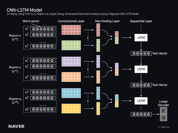 다음은 “Dimensional Sentiment Analysis Using a Regional CNN-LSTM Model” 논문에서 제안한 CNN-LSTM 모델의 아키텍처이다.