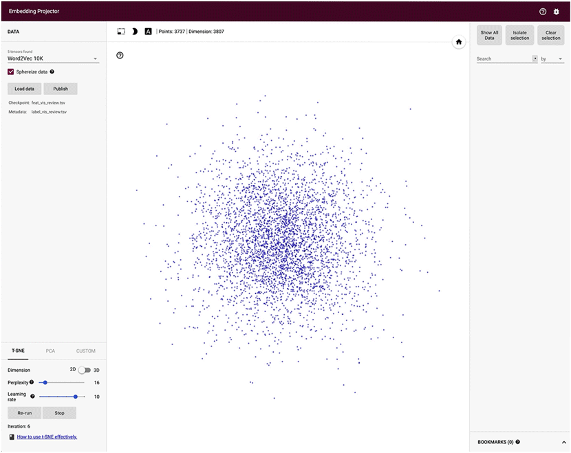카테고리 자동 매칭 모델을 적용하기 전에 카테고리 매칭 결과가 올바른 분포를 가지고 있는지 확인할 수 있는 방법이 있어야 한다. TensorFlow의 Embedding Projector에 데이터에 맞는 feature vector와 label을 업로드하면 카테고리 분포와 카테고리 간의 거리를 눈으로 쉽게 확인할 수 있다. 다음은 약 4,000개의 카테고리 vector를 시각화한 결과이다.