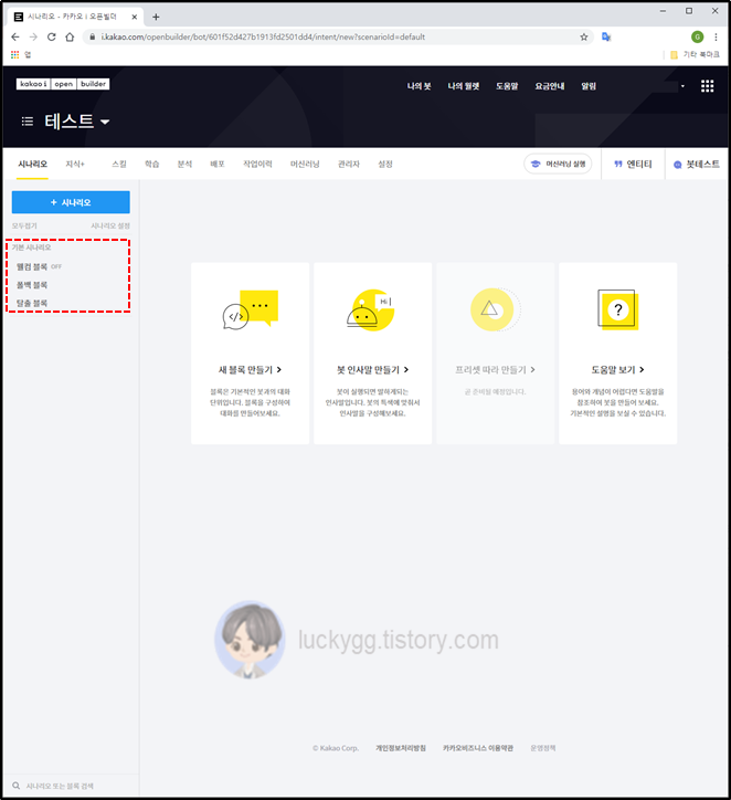 오픈 빌더 사이트에 로그인을 하면 제일 먼저 시나리오 탭이 보입니다.