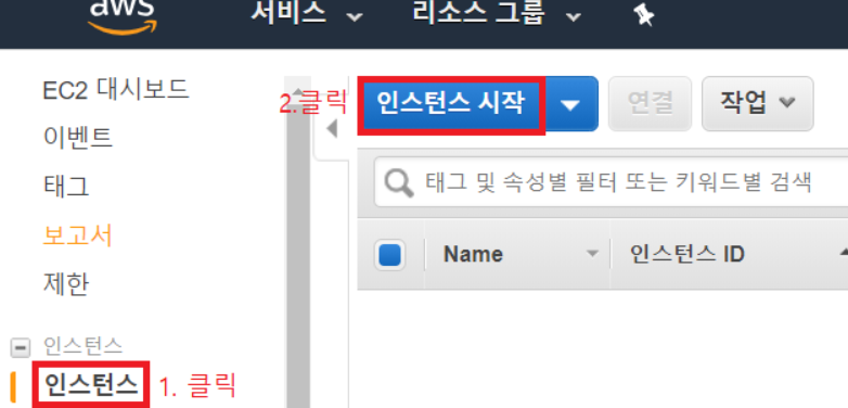 - 다음 화면에서 해당 그림과 같이 [ 인스턴스 시작 ]을 클릭하여준다.