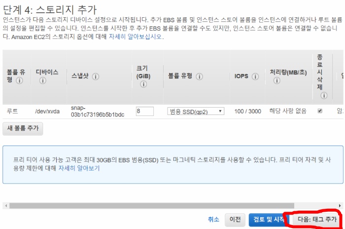 - 볼륨 유형 : SSD가 두 종류가 있는데, 프로비져닝된 IOPS SSD가 있는데 이는 직접 저장장치의 속도를 지정할 수 있다.