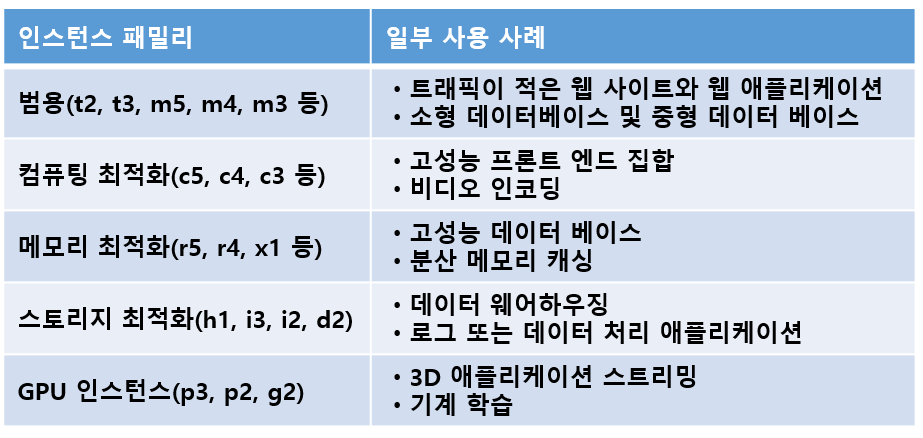 Compute optimized(컴퓨팅 최적화), Memory optimized(메모리 최적화), Storage optimized(스토리지 최적화)