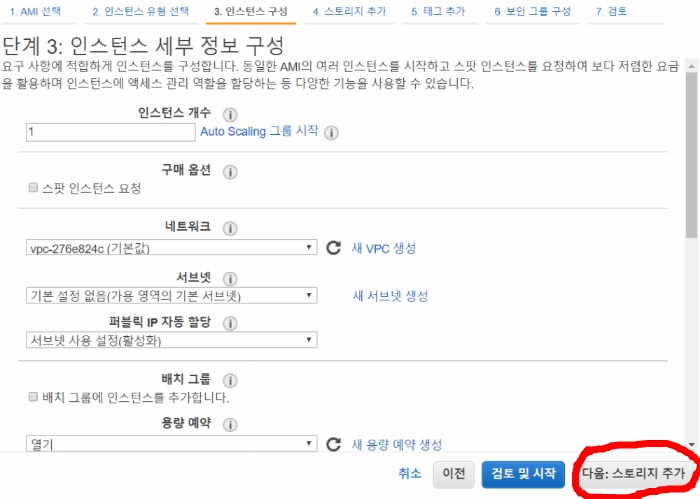- 구매 옵션 : 스팟 인스턴스란 AWS에서 유휴(놀고 있는, 사용하지 않는, 여유) 컴퓨터가 많은경우 할인 받을 수 있는 요금제라고 볼 수 있다.