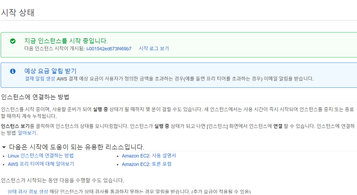 - 키페어 저장이 끝났으면 [ 인스턴스 시작 ] 클릭.