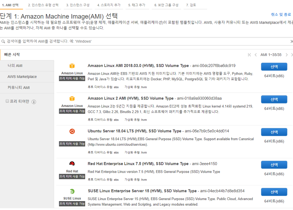 - Amazon Machine Image(AMI) 선택 이라고 하는 것은 운영체제를 선택한다고 보면 된다.
