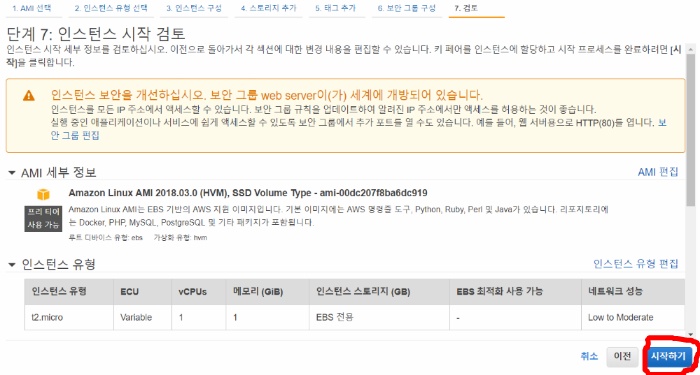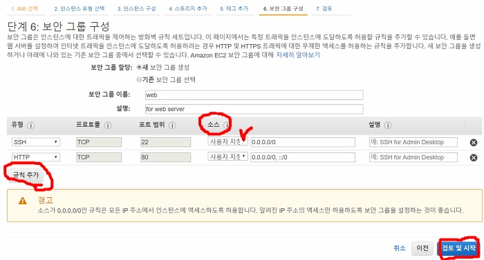 - 나와 같은 경우는 SSH, HTTP 만 접속 허용하도록 설정하고 [ 검토 및 시작 ] 을 클릭하여 주었다.