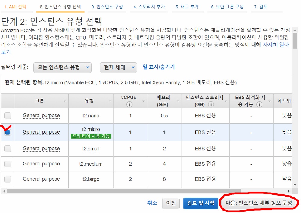 - 우린 일단 t2.micro (프리 티어 사용 가능)을 클릭, [다음: 인스턴스 세부 정보 구성] 을 클릭하여 준다.