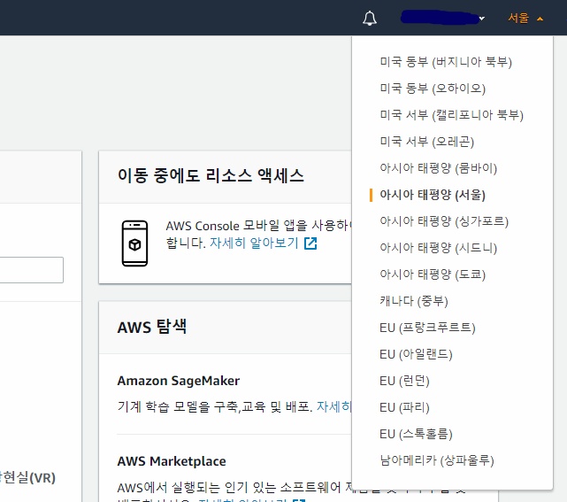 - 선택후 보이는 서비스들이 해당 리전(서울)에서 서비스 가능한 리스트 이다.