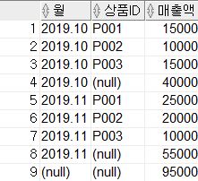 SELECT 상품ID, 월, SUM(매출액) AS 매출액