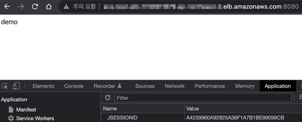일단 위와 같이 로그까지 확인했는데 각 EC2의 public IP가 달라서 실제 동작 확인은 할 수 없었다. 그래서 좀더 테스트 해보는 차원에서 EC2 2개를 타켓 그룹으로 묶고 앞에 ALB를 붙여서 was1로 접속 확인 후 was1번 내리고, was2로 접속 했을 때 JSESSIONID가 변하지 않는 것을 확인했다. 다시 was1을 올리고 was2를 내렸을 경우에도 JSESSIONID가 변하지 않는것을 확인했다.
