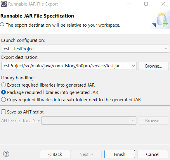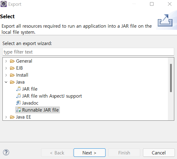 2. 해당 파일을 Runnable JAR file로 Export 한다.