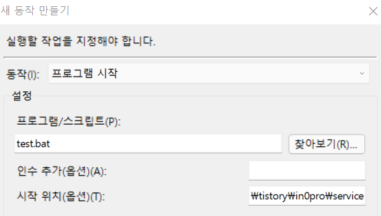 프로그램/스크립트 칸에는 배치 파일명만 입력한다.