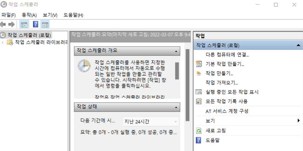 5. 이제 윈도우 작업 스케쥴러를 열어서 배치파일을 등록하면 된다.