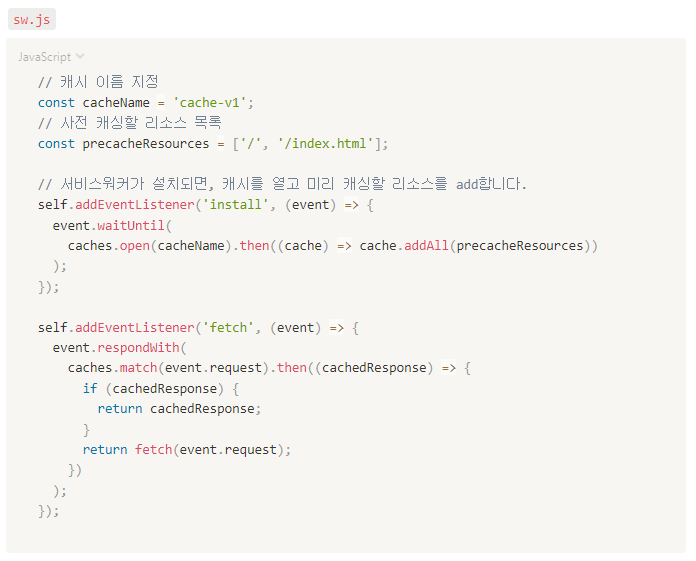 Service Worker에 대한 자세한 내용은 이 발표 주제의 범위를 넘어가므로 이 예제에서는 앱이 오프라인에서 미리 캐싱 된 리소스로 동작할 수 있게 하는 최소한의 코드만 작성하겠습니다.