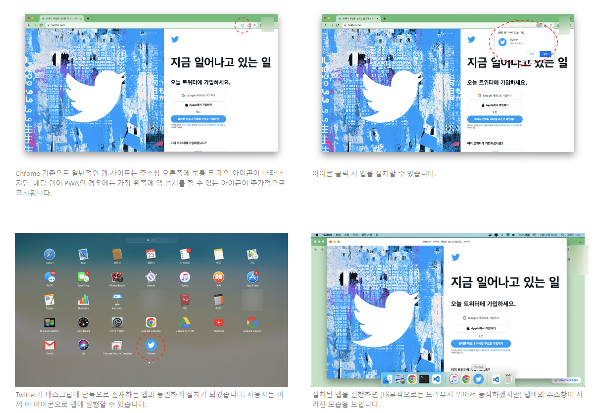 먼저 PWA가 사용자의 기기에 어떻게 설치될 수 있는지대표적인 PWA 적용 사례인 Twitter를 예로 들어 보겠습니다.