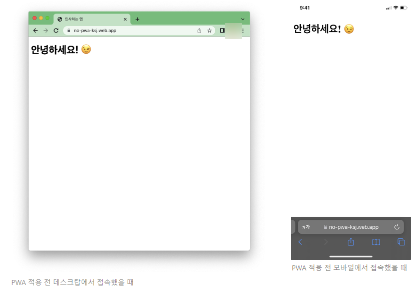 (위) PWA 적용하지 않은 일반 웹을 검사했을 때 / (아래) PWA 적용한 웹을 검사했을 때
