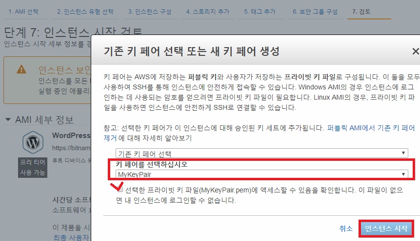- 키페어 설정하는 방법도 이전 포스팅에 작성해 두었다. 난 이미 만들어둔 KeyPair 선택.