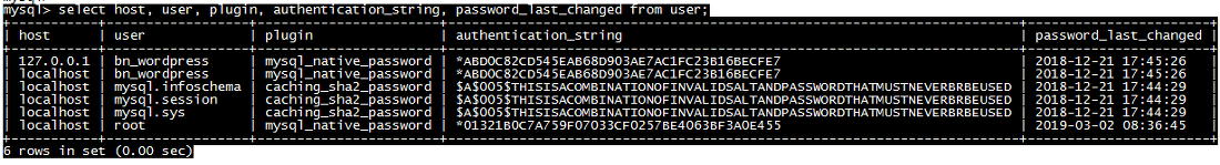 - select host, user, authentication_string, password_last_changed from user;