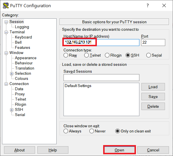 설치가 끝나면 폴더 내의 putty.exe 실행 파일을 실행하자. 그러면 아래의 창이 뜨는데, 원격으로 접속하려는 IP 주소를 입력하고 [Open] 버튼을 누른다. 검은 화면의 터미널이 열리고 login 여부를 묻는다면 성공적으로 원격 서버에 접속한 것이다.